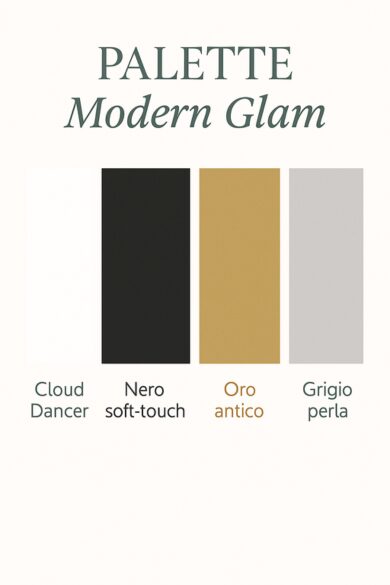 Palette Modern Glam con Cloud Dancer, nero soft-touch, oro antico e grigio perla per matrimoni moderni e glamour.