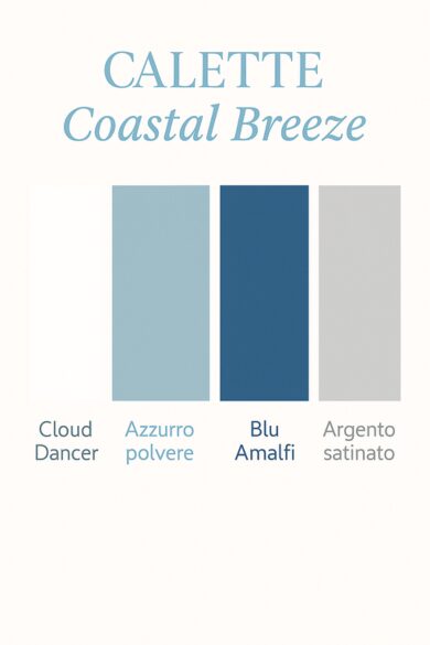 Cloud Dancer incontra l’azzurro polvere, il blu Amalfi e l’argento satinato in una palette perfetta per destination wedding e matrimoni vista mare.