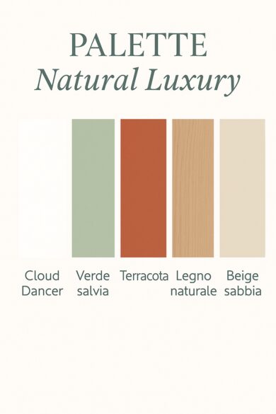 Una palette ispirata alla natura: Cloud Dancer, verde salvia, terracotta, legno naturale e beige sabbia. Un mix armonico per eventi chic dal sapore organico